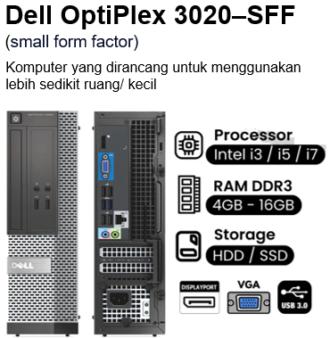 - Berbagai varian Dell OptiPlex 3020 SFF tersedia di pasaran dengan harga yang berbeda-beda. sesaui dengan Spesifikasi yg dipakai